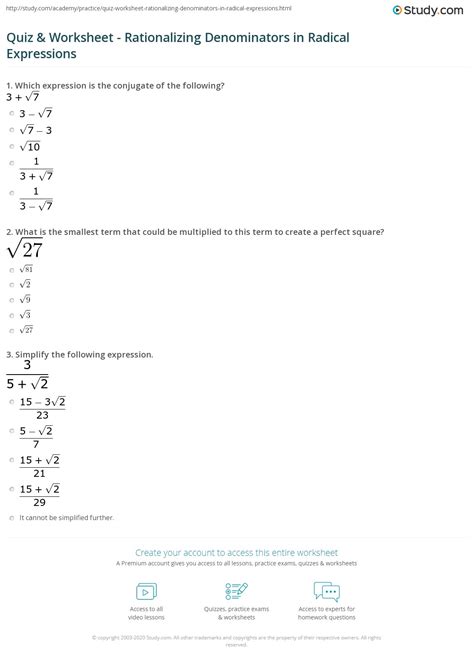 Worksheets are dividing radical, radicals, rationalize the denominator and multiply with radicals, rationalize. Rationalize the denominator 1) 3) 5) 7) 9) 2) 4) 6) 8) 10) 11! This quiz tests your ability to: